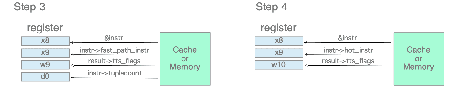 From this base address, the code separately loads the fast_path_instr (ldrb w9, [x8]) and the tuplecount (ldr d0, [x8, #32]).