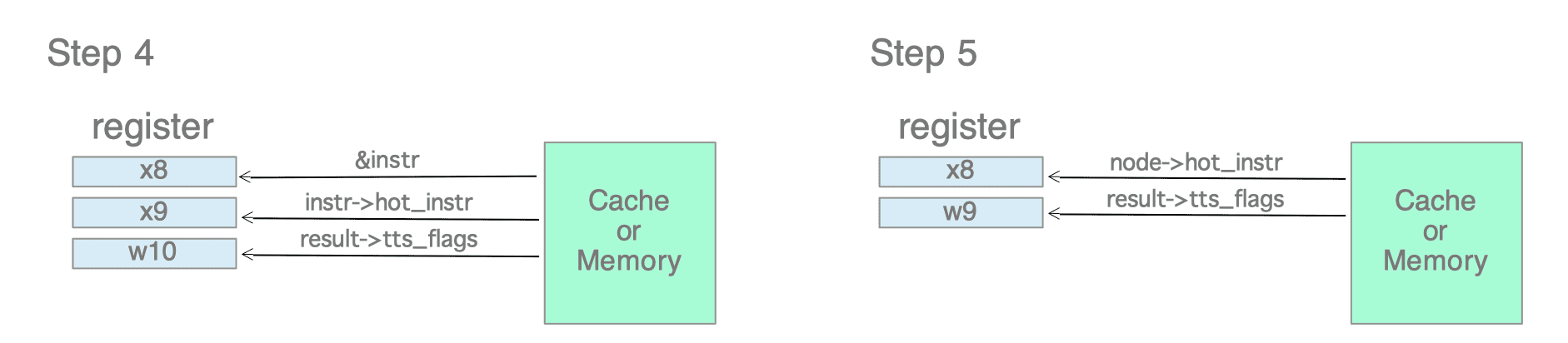 After loading the address of instr into register x8, the code loads the hot_instr into register x9 (ldr x9, [x8]) and the tts_flags from the result pointer into register w10 (ldrh w10, [x1, #4]).